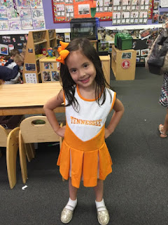 She's wearing her mom's cheer leading outfit from when she was little. SO SWEET!