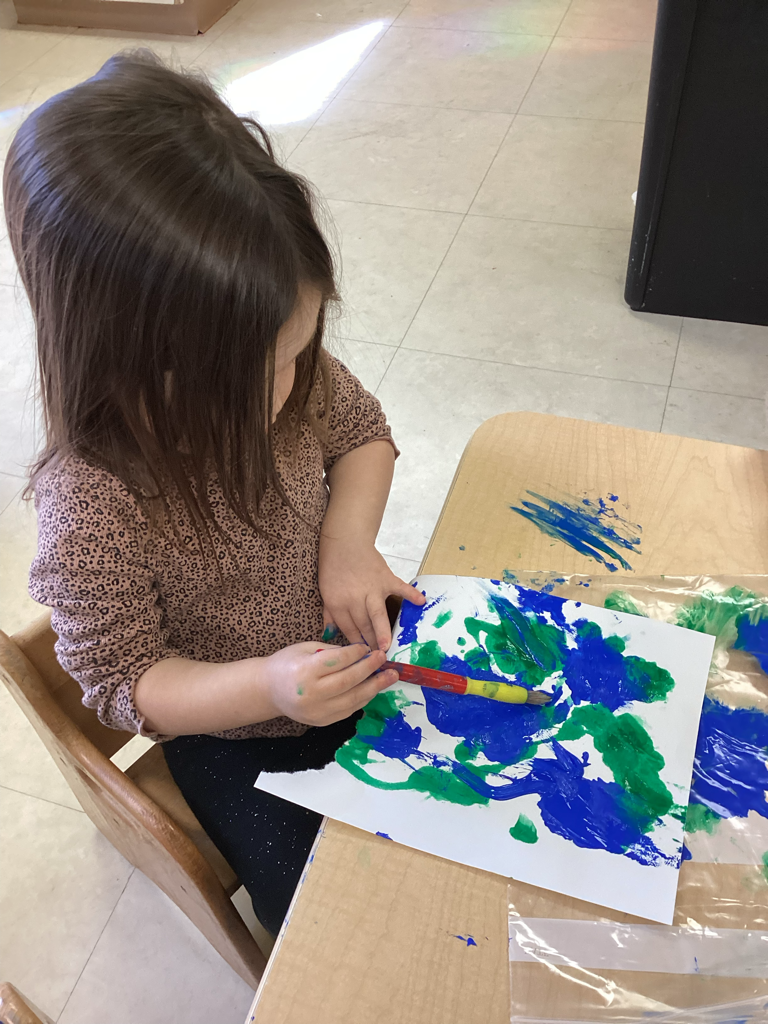 Check it out! We are learning about blue and green this week! The children have been so curious and have enjoyed exploring these colors in various ways. They learned about mixing colors. They used photo cards to see blue in familiar ways. With their photo cards, teachers stimulated discussion around the photographs and expanded the toddler's vocabulary. They also practiced finding blue objects during an activity called "Seeing Blue". They will repeat these lessons for the color green, as well. Learning to apply their knowledge to new situations allows them to develop their critical thinking skills. Throughout the month the children have discovered and explored red and orange and are looking forward to working with black and white!